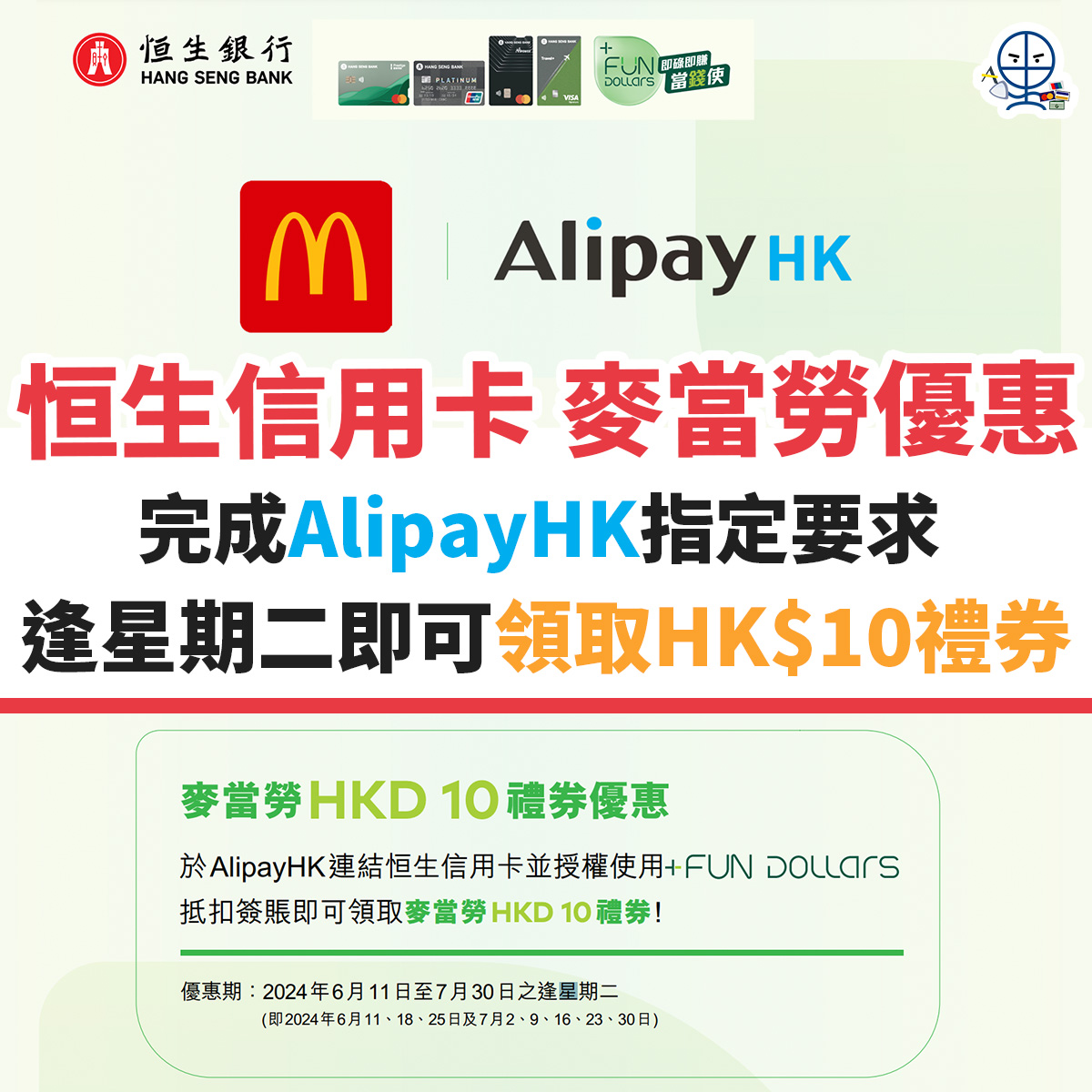 恒生同麥當勞又有新優惠啦!大家只要喺推廣期間用AlipayHK連結恒生信用卡,再授權使用+FUN Dollars抵扣簽賬,就可以逢星期二領取麥當勞HK$10禮券!提提大家禮卷喺領取後72小時內就要用,滿HK$20就可以享用㗎啦~