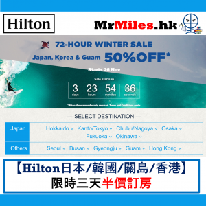 嘩!9月份Hilton希爾頓做完日本六折優惠,呢加又有半價優惠啊!下星期二(11月26日)香港時間1PM 開搶!聖誕新年出遊嘅朋友可以睇睇,呢加可以睇住先選定先喇!按經驗呢個折扣係真折扣嚟架!真係堅抵架!嚟緊去日本的話快啲睇定有咩Hilton酒店想住,快手去訂!已經鑽石挑戰緊嘅朋友又要出門就啱晒!