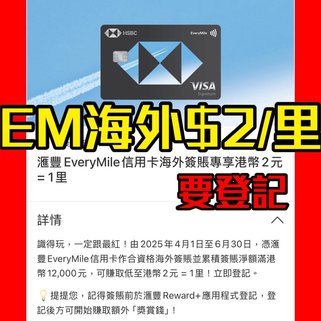 - 憑滙豐EveryMiles信用卡累積滿HK$12,000海外及外幣簽賬,全部海外及外幣簽賬都係$2/里!