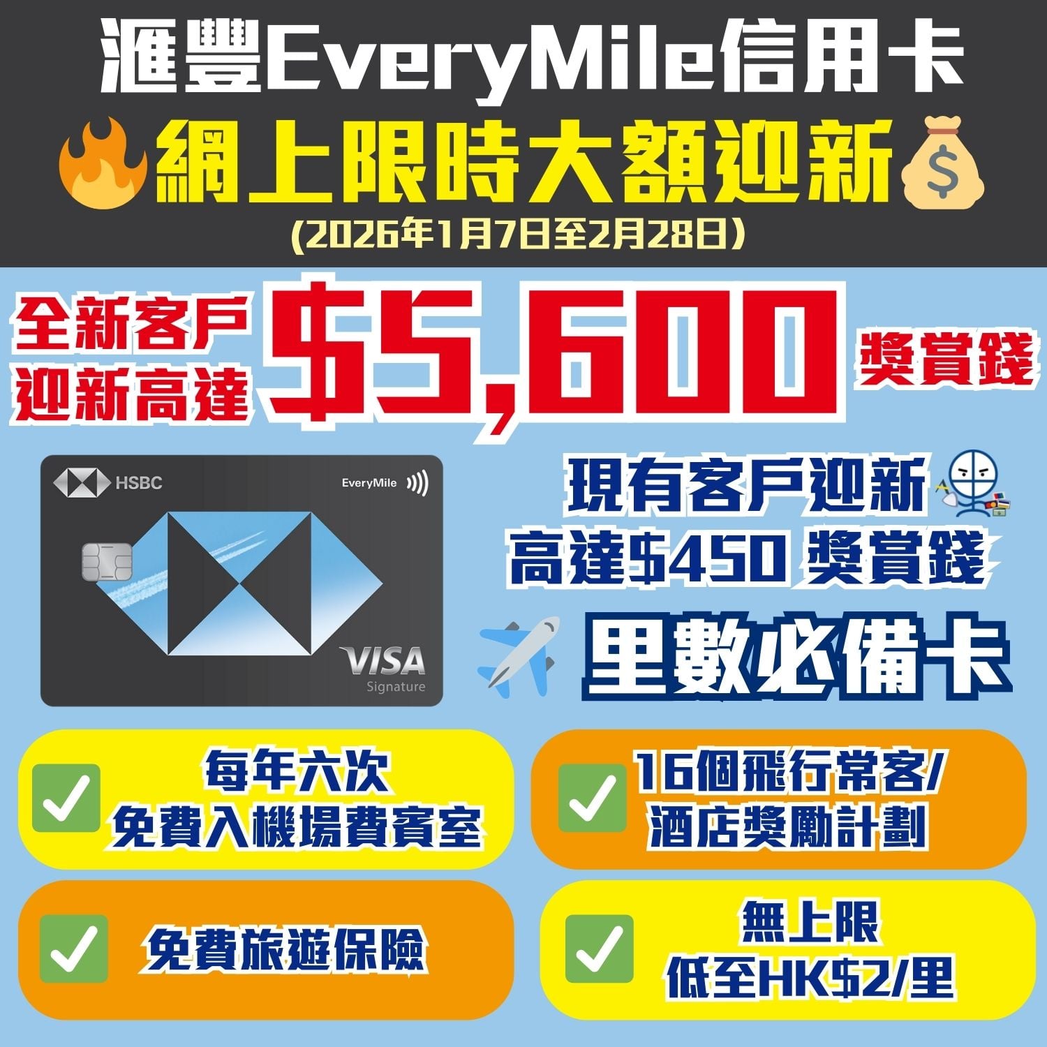- 滙豐EveryMile信用卡額外迎新優惠期:2026年1月7日至2月28日