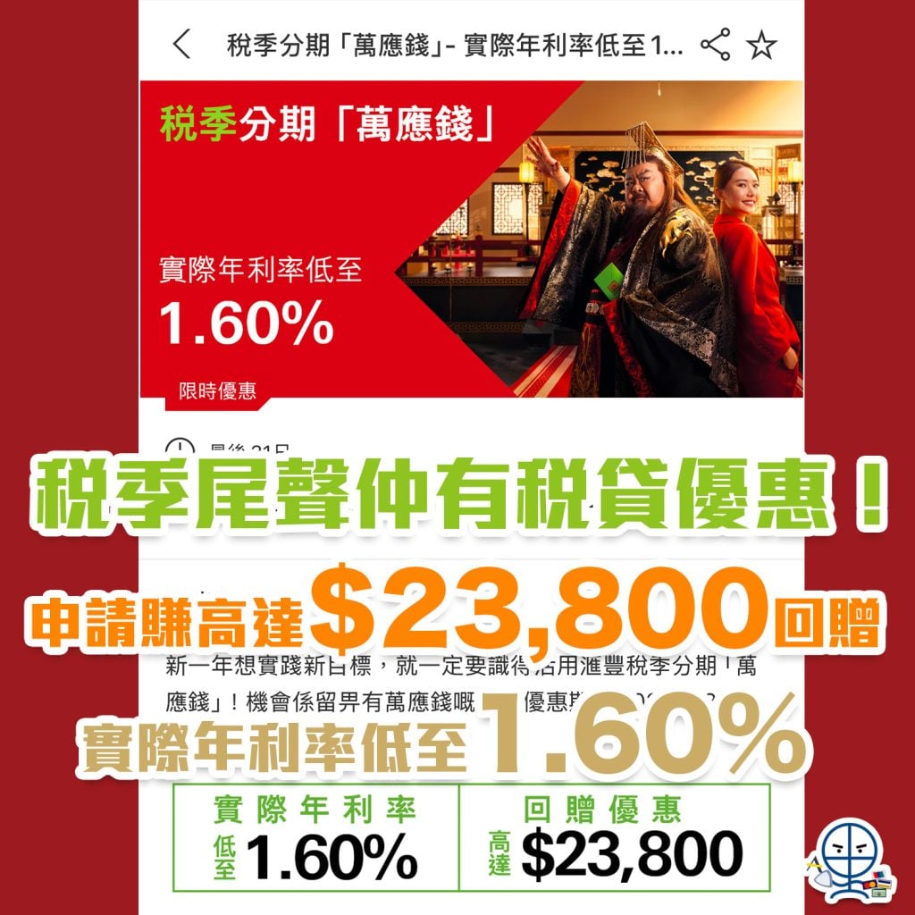 稅季尾聲仲有稅貸優惠!申請滙豐稅季分期「萬應錢」賺高達$23,800回贈+實際年利率更低至1.60%!
