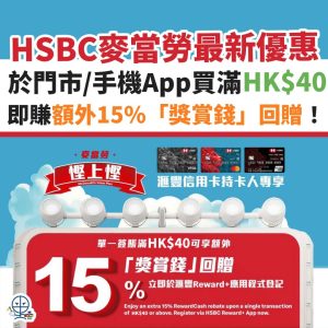滙豐 麥當勞優惠︱HSBC 信用卡於麥當勞單一簽賬滿HK$40即賺額外15%獎賞錢!