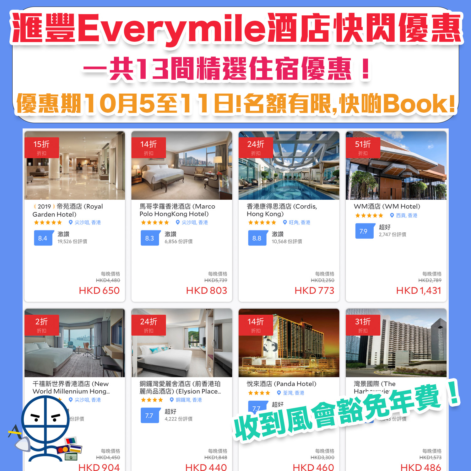 10月快閃又嚟啦!滙豐EveryMile信用卡Agoda優惠,優惠期2022年10月5日至11日,今次都幾多選擇,有13間酒店。當中都有唔少五星級酒店﹐例如WM Hotel四季酒店等﹐今次連千禧新世界香港酒店帝苑酒店都有份!有滙豐EveryMile信用卡而最近又想去Staycation嘅朋友快啲睇埋詳情啦!