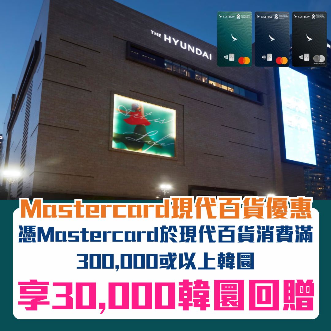 Mastercard現代百貨優惠,去韓國旅行憑渣打國泰Mastercard於現代百貨消費滿300,000或以上韓圜享30,000韓圜回贈,優惠期由即日起至2025年6月30日,每位持卡人仲可以享用優惠3次,簽賬前記得登記咗先。