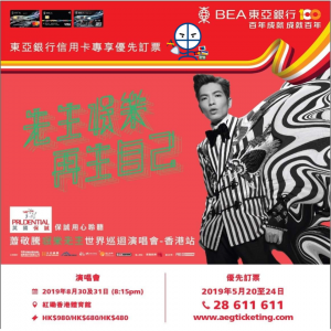 - 東亞信用卡優先購票日期:2019年5月20日至24日上午9時至晚上9時