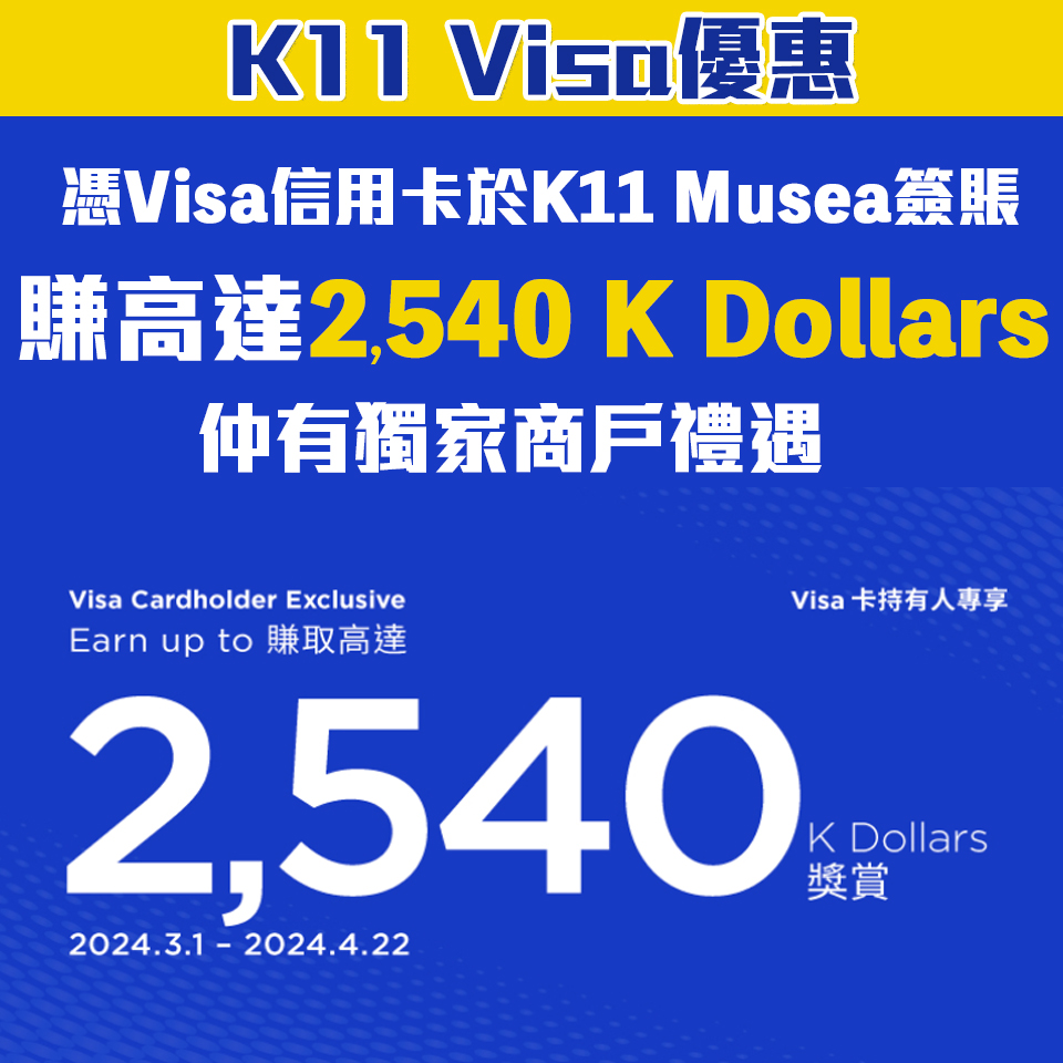 • 憑Visa信用卡於K11 MUSEA簽賬滿指定金額,可賺合共高達2,540 K Dollar