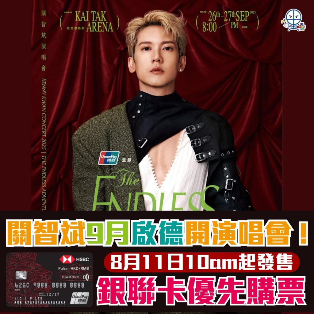 關智斌啟德演唱會 2025 《The Endless Adventure Live》將於9月啟德開show!UnionPay 銀聯卡8月11日起可以優先買!一文睇晒 關智斌演唱會2025 時間/門票價格/發售詳情/座位表。