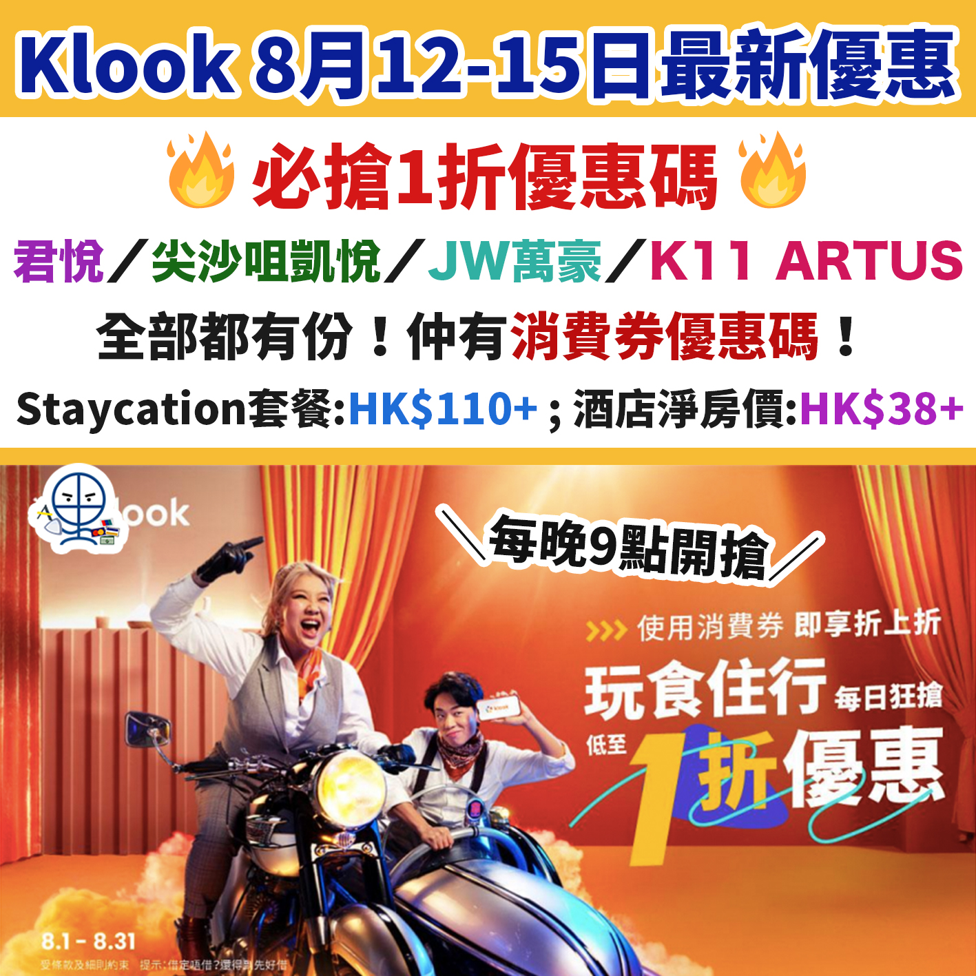 Klook 【8月快樂狂賞】Staycation優惠+必搶1折優惠碼