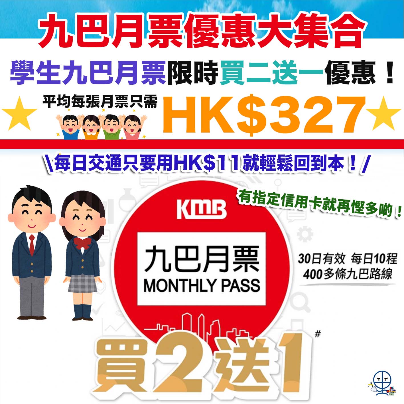九巴月票優惠大集合!學生限定,九巴月票買2送1 每張低至HK$327就有!每日用HK$11蚊就已經抵返!有指定信用卡仲可以再平啊!
