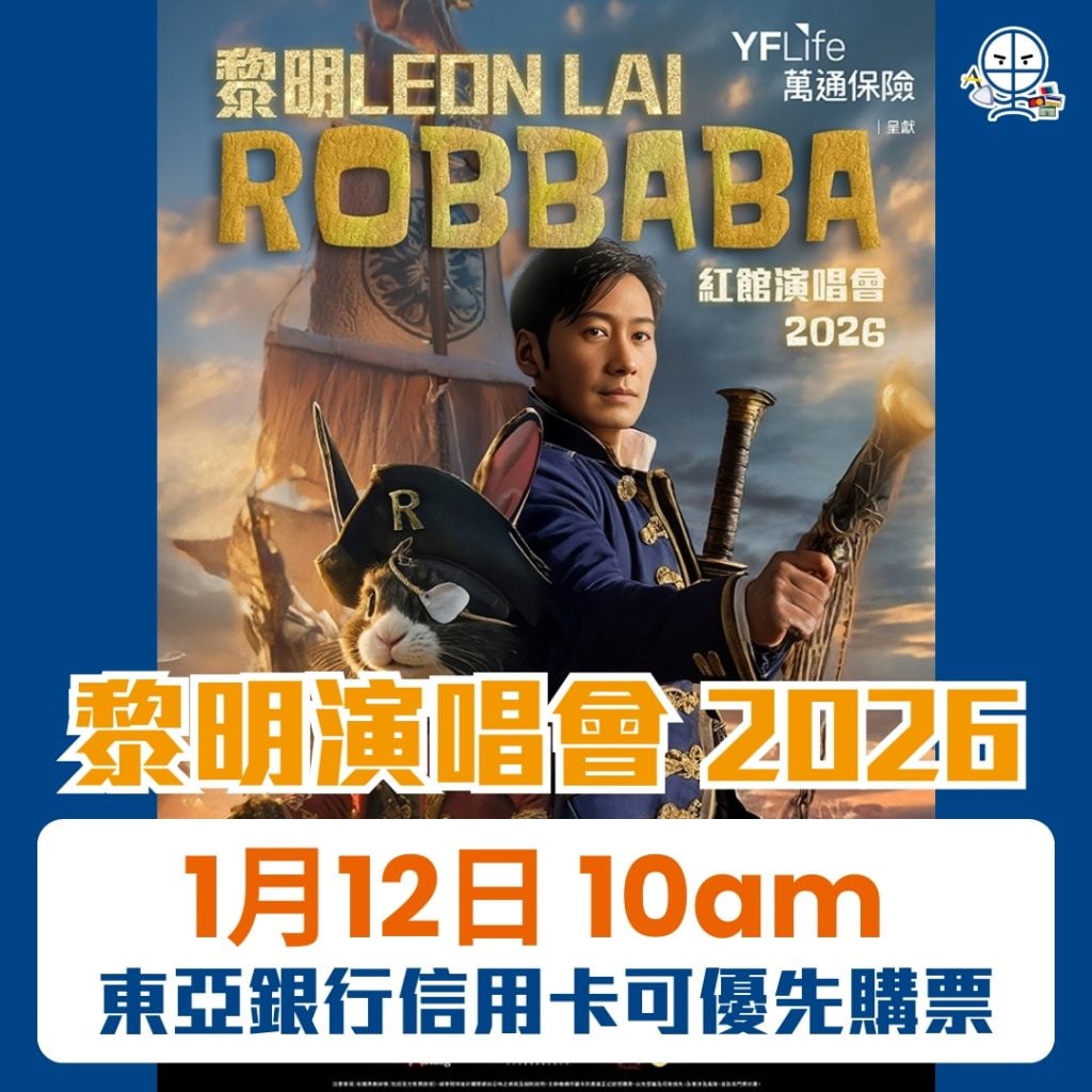 《黎明 LEON LAI ROBBABA 紅館演唱會2026 》將於2026年3月22至29日20:15在紅磡香港體育館舉行!東亞銀行信用卡2025年1月12日 (星期一) 10 am優先搶飛!即睇優先及公售詳情,仲有獨家搶飛流程教學!