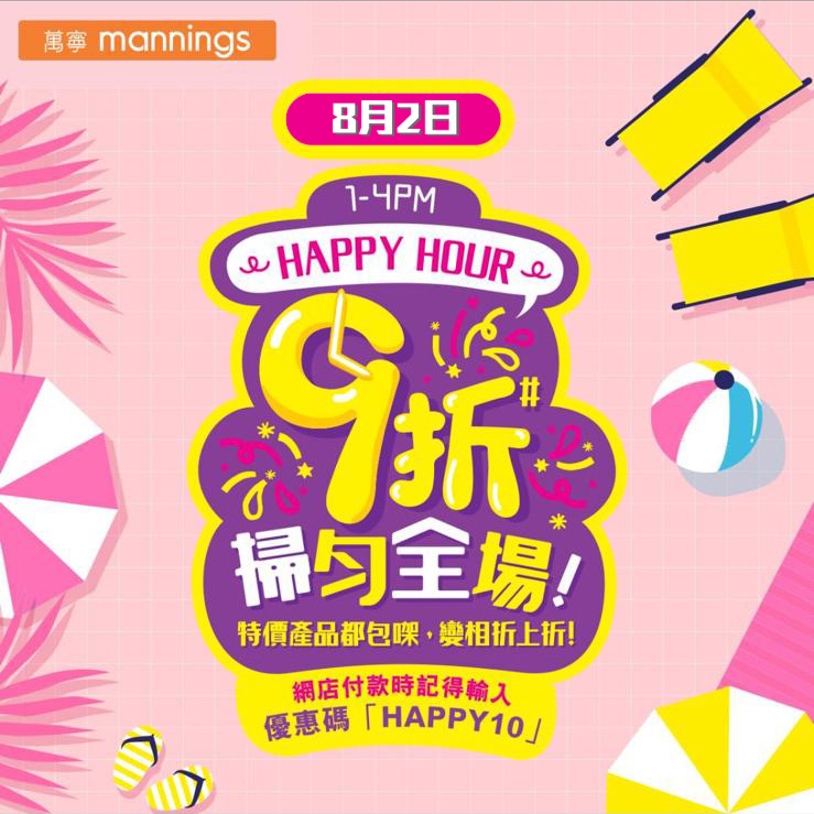 萬寧嘅Happy Hour優惠再度登場,8月3日下午1點至4點,萬寧全場多款產品都可享有9折優惠,去萬寧網上商店購物都可同步尊享9折,只要喺付款頁面輸入優惠碼「HAPPY10」。