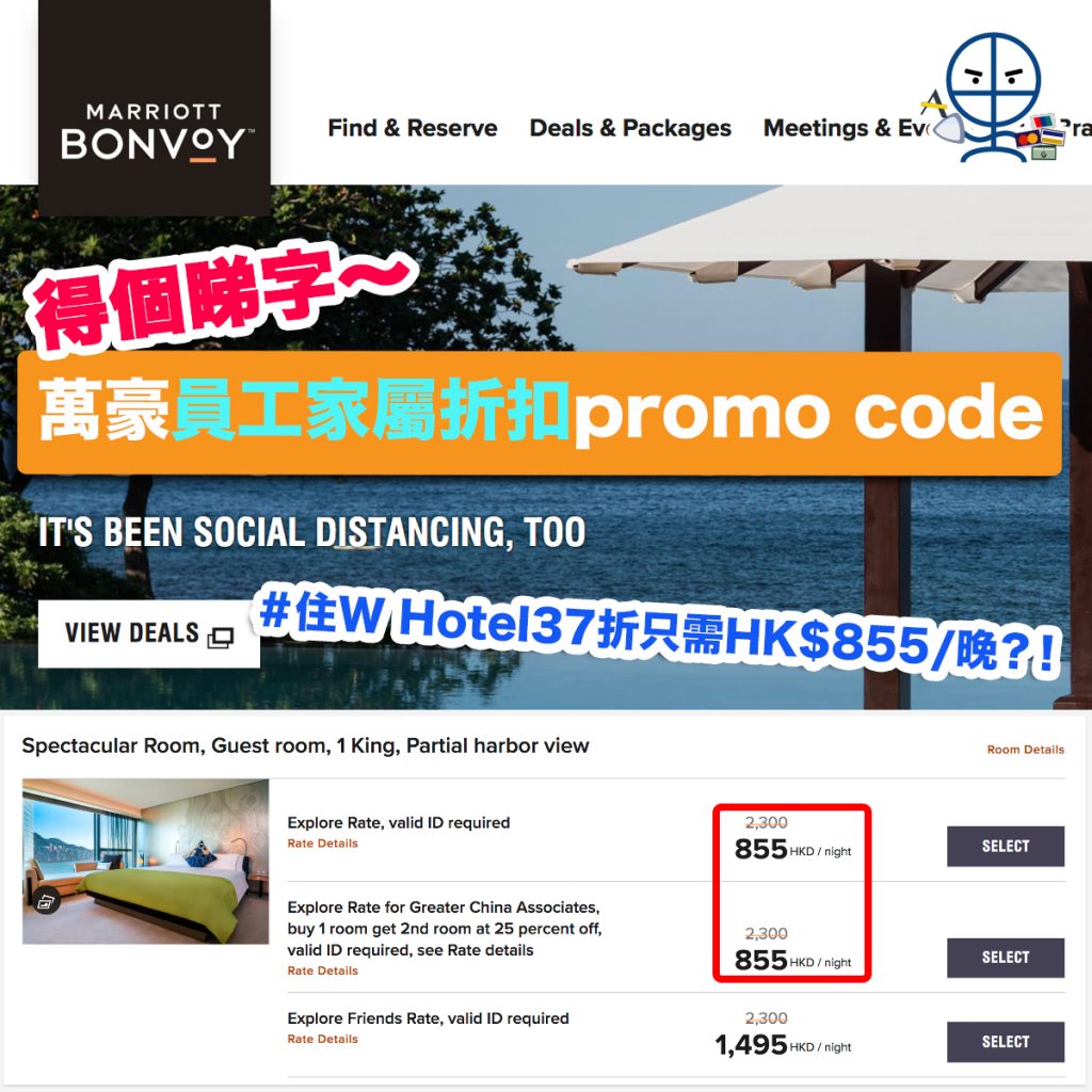 自己親自試過入promo code睇吓香港酒店個價,都真喺折到好多,例如W Hotel優惠可以高至37折,住Spectacular Room都喺HK$855一晚!我仲試咗其他酒店,下面有圖你睇睇!