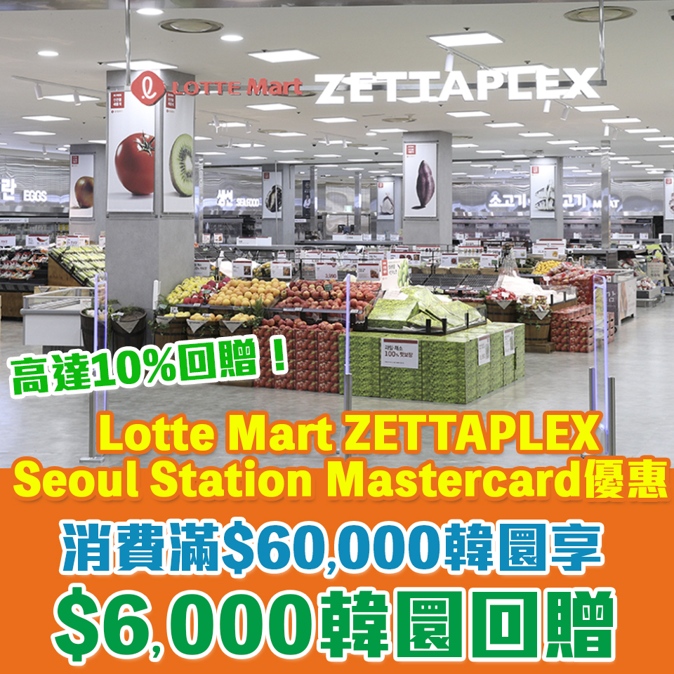 - 憑已登記Mastercard於樂天LOTTE MART ZETTAPLEX Seoul Station消費滿60,000或以上韓圜賺取6,000韓圜回贈(即高達10%現金回贈)