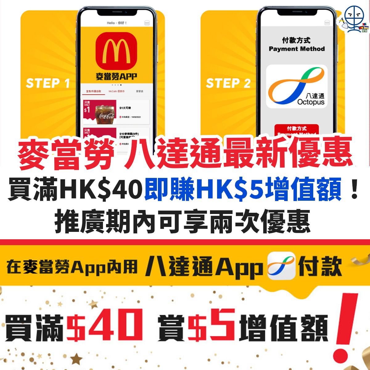 麥當勞 八達通優惠︱買滿HK$40即享HK$5獎賞!推廣期內可用兩次!近排去買麥當勞記係要用八達通俾錢啊!因為岩岩就出左新優惠,只要係麥當勞買滿HK$40再用八達通/八達通銀包俾錢,就可以賺HK$5獎賞!優惠期內可以用兩次!