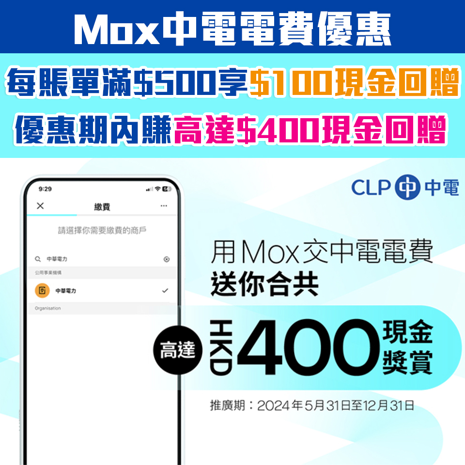 堅抵!憑Mox繳交中電單一賬單滿HK$500即享HK$100現金回贈呀!今期都唔使諗用邊張信用卡交電費,用晒Mox一定最抵!優惠期內最多可享用優惠4次 x HK$100,即高達HK$400現金回贈,要注意嘅係每個月只可享用優惠1次。優惠期由即日起至2024年12月31日。