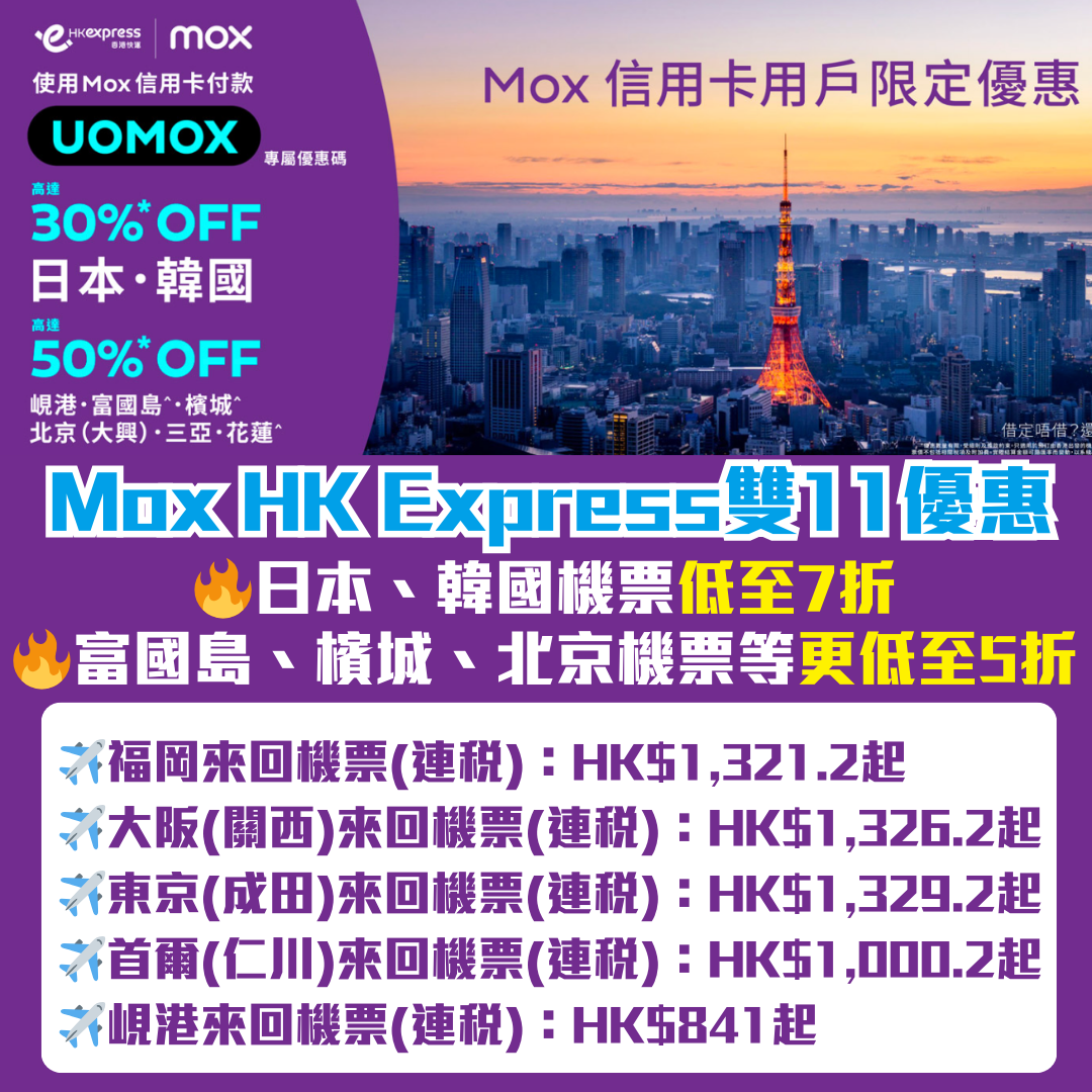Mox信用卡HK Express雙11機票優惠!即日起至2024年11月13日期間,預訂以下指定目的地機票並輸入優惠碼享即時折扣優惠!