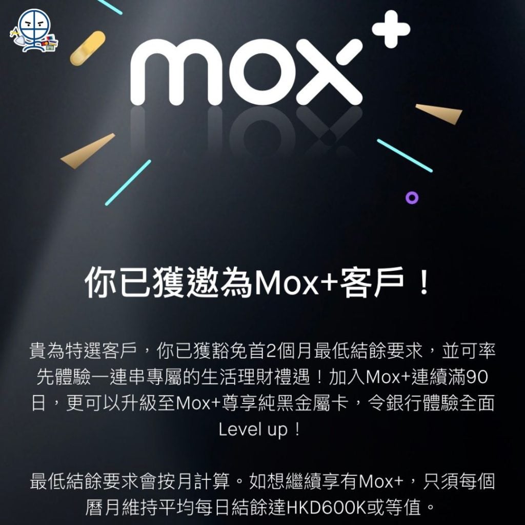 Mox Bank 規定 Mox Plus 會員的升級門檻為平均每日資產結餘達港幣 600,000 元或等值。受邀的特選客戶加入 Mox Plus 可獲豁免首 2 個月最低結餘要求。
