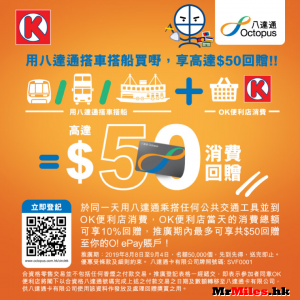 八達通最近推出咗唔少優惠,今次就同咗OK便利店推出消費回贈優惠。今次玩法算簡單,只要用八達通搭任何交通工具並於同一天內到OK便利店內消費,當天OK消費總額可享10%回贈,啫係你搭程車番工之後去OK消費都有9折優惠。最高可享HK$50回贈去你O!ePay賬戶,優惠期由2019年8月8日至9月4日。名額有限50,000位先到先得。今次優惠係要係網上登記同埋要有O!ePay賬戶先得。想玩今次優惠嘅記得快手下載番O!ePay先,未識點用可以睇番O!ePay教學。