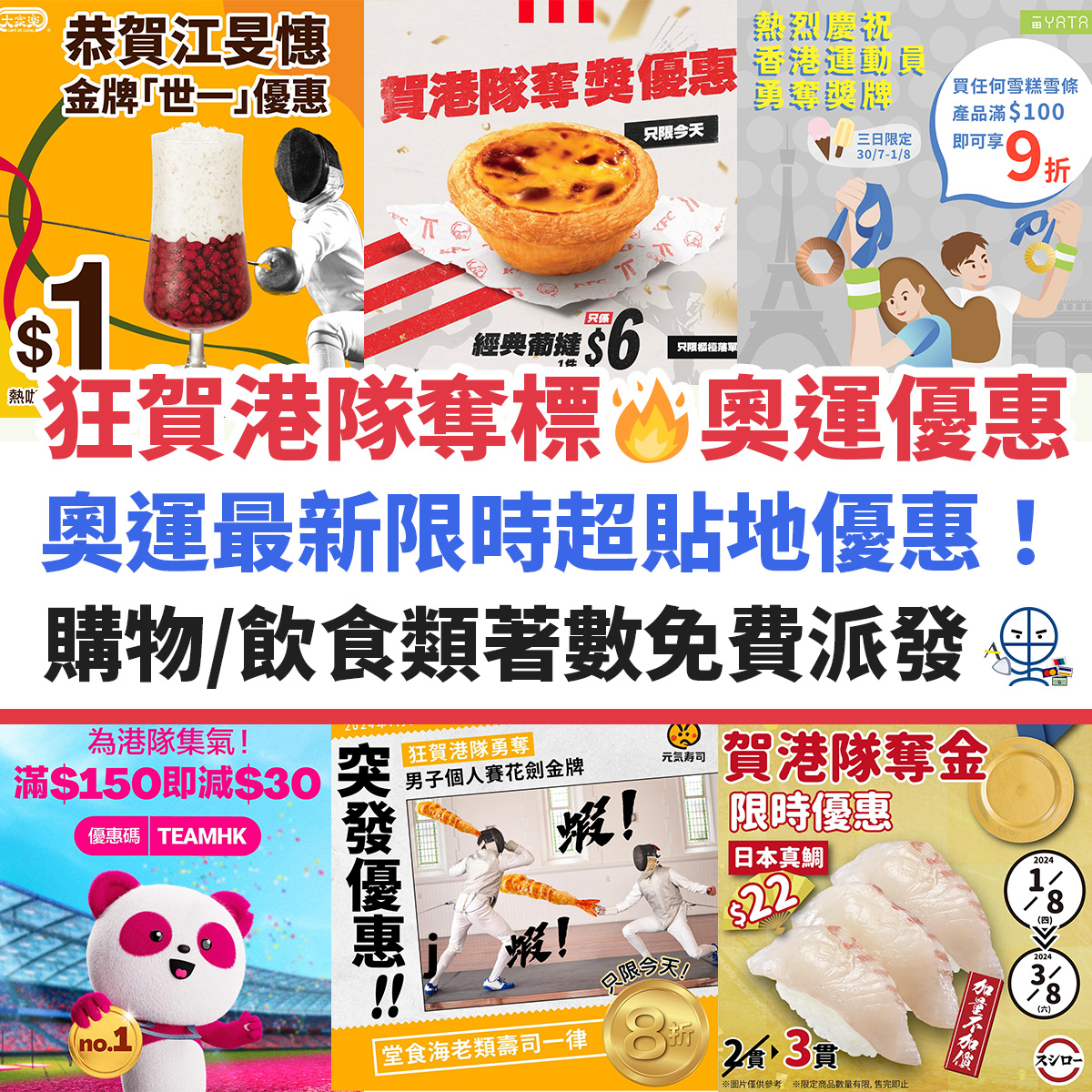 狂賀港隊奪標!奧運超貼地限時優惠2024︱本地小店商家推出奧運超抵著數!全港狂賀江旻憓Vivian、張家朗同何詩蓓係奧運奪兩金牌兩銅牌!呢幾日都好開心,而各商戶都與民同樂鼓勵一眾香港隊運動員,唔同大小嘅本地商店都推出超限時優惠!當中有勁多貼地飲食購物著數,即刻睇吓有冇邊個啱你洗!