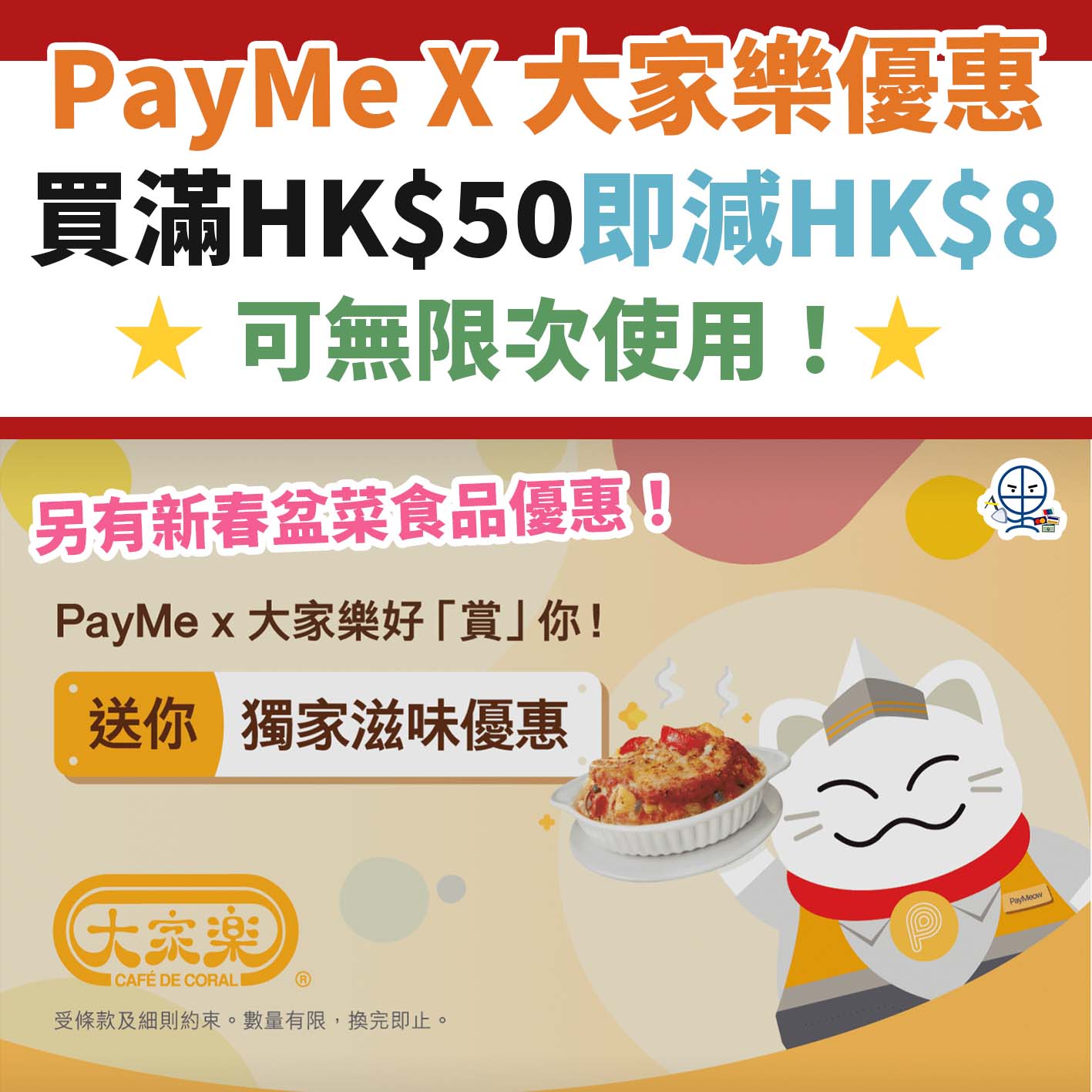 PayMe 大家樂優惠︱買滿HK$50即減HK$8!可無限次使用!另有新春盆菜食品優惠!