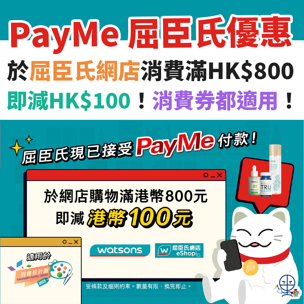 PayMe 屈臣氏優惠︱消費券都用得!於屈臣氏網店買滿HK$800即減HK$100!可用兩次!
