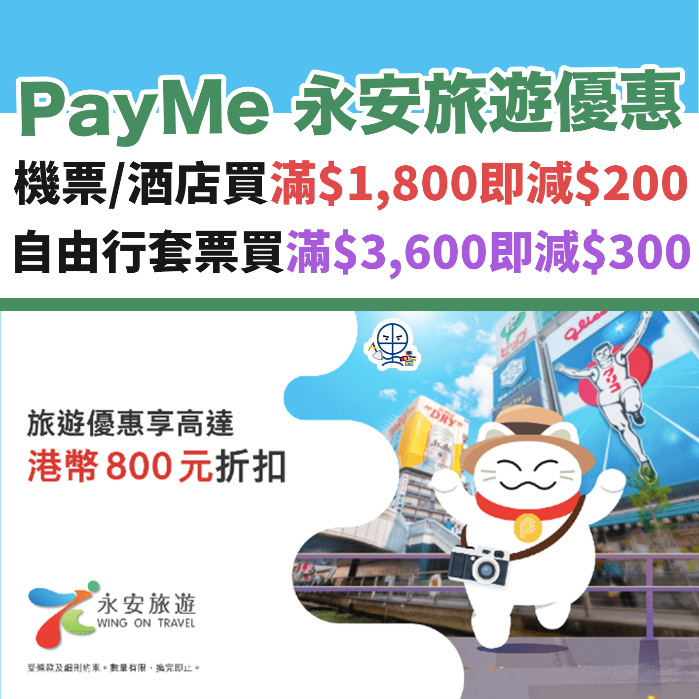 PayMe最新推出咗旅行優惠!只要喺永安旅遊輸入指定優惠碼,訂購機票/酒店買滿HK$1,800就即減HK$200!而自由行套票買滿HK$3,600即減HK$400!推廣期為即日至2023年12月31日!啱洗嘅朋友就千其唔好錯過啦!
