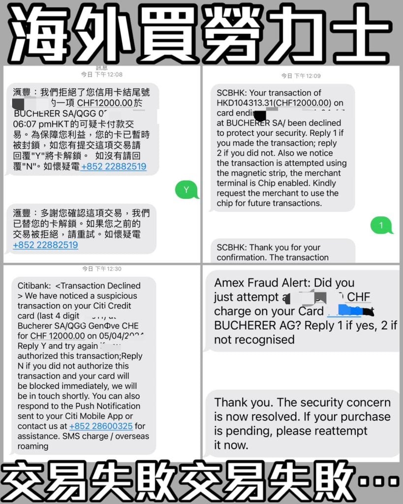 其實有呢啲過唔到數嘅情況我諗係Bucherer呢啲商戶係銀行角度都係高風險,我自己估係好多賊去盗用信用卡最想都係變現,而名錶差不多相當於黃金,要變現容易,所以無啦啦碌十萬咁就出咗fraud alert。係有為我購物做成不便但總好過當有遺失盗用情況出現,突然唔見十幾萬我仲驚,保障卡主做嘅precaution 我是能理解的,不過都嚇親🥲