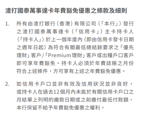 - 渣打係2024年6月8日更新信用卡條款,只要持卡人喺上年度符合最低結餘要求之優先理財、Premium理財或出糧戶口客戶即可享年費豁免