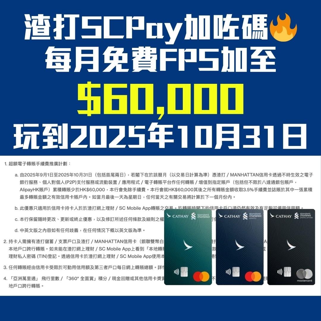 渣打戶口SC Pay 2025|渣打信用卡FPS轉數快免手續費賺Free Cash Flow,變相免息現金套現!每月HK$6萬loop loop loop,呢加美元定期息高用嚟賺息差啱晒!渣打FPS射錢2025年9月起免費上限由每月HK$40,000改為每月HK$60,000。你有渣打戶口(包括渣打easy/premium戶口及渣打優先理財戶口)的話登記完Standard Chartered FPS可以直接選用渣打信用卡轉數快嚟轉錢走(俗稱射錢),包括你應該已有嘅渣打國泰信用卡, 渣打Smart卡同Simply Cash信用卡 (但渣打銀聯信用卡不適用)。每曆月首HK$60,000 (優惠期至2025年10月31日!)可以免3.5%的手續費。再盡啲想延得長啲可以用埋渣打月結單分期,息唔算貴但可以分期返FPS個金額。想用渣打SC PAY賺Cash flow第一步就要有個渣打戶口。