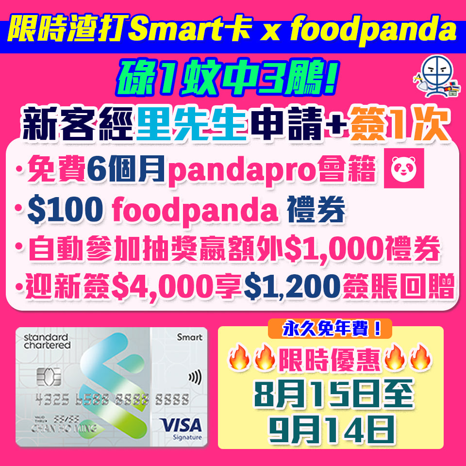 限時優惠🚨【渣打Smart卡 x foodpanda – 碌1蚊中3鵰!】經里先生成功申請+簽1次(簽HK$1都得呀!) 送6個月pandapro會籍+HK$100 foodpanda優惠券仲自動參加大抽獎有機會嬴額外HK$1,000 foodpanda優惠券