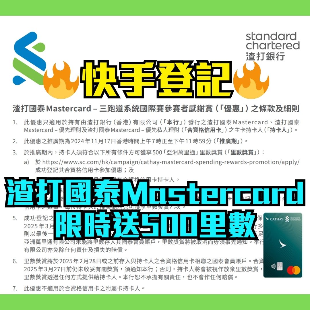 渣打國泰Mastercard 送500里數優惠要點先拎到?