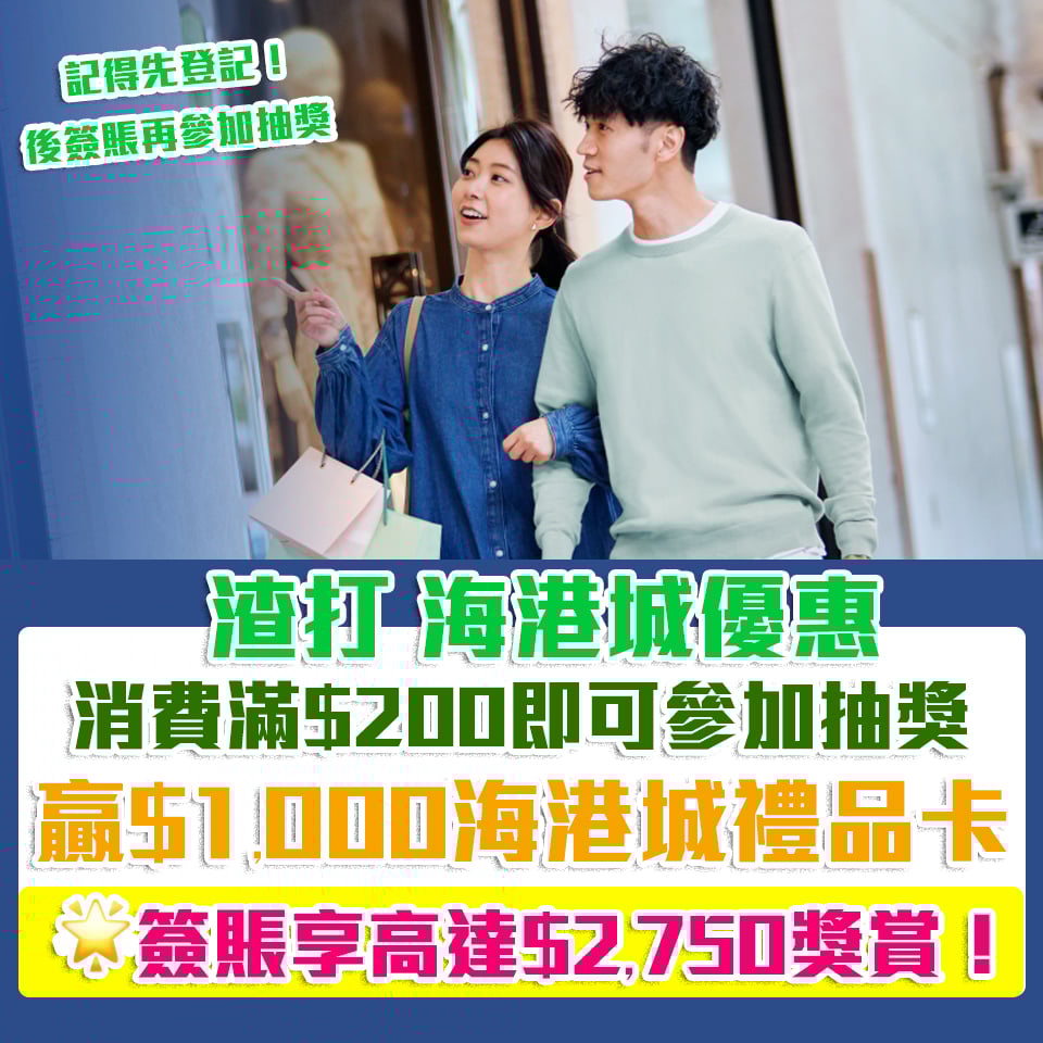 渣打海港城優惠!憑渣打信用卡喺海港城簽賬指定金額享高達HK$2,750獎賞!再登記埋渣打大抽獎優惠,每消費滿HK$200即可參加抽獎贏走HK$1,000海港城禮品卡!