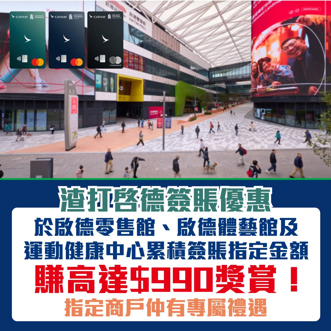 渣打啓德簽賬優惠!渣打信用卡喺啟德零售館、啟德體藝館及運動健康中心簽賬滿指定可享高達HK$990獎賞!喺指定商戶仲有專屬禮遇添,優惠期由即日起至2025年6月30日。