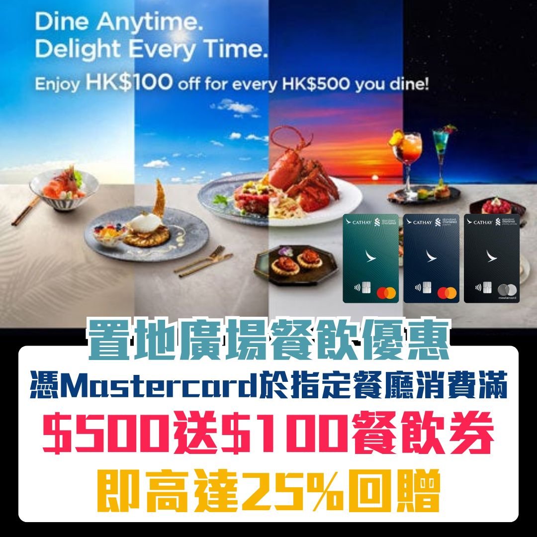 - Mastercard餐飲禮遇:於指定餐廳消費滿HK$500,即享HK$100餐飲禮券