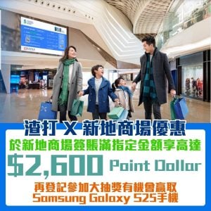 渣打新地商場優惠,由即日起用渣打信用卡喺新地旗下商場簽賬高達$2,600 Point Dollar,再登記參加埋大抽獎,隨時有機會贏到最新Samsung Galaxy S25手機。優惠期由即日起至2025年5月15日。