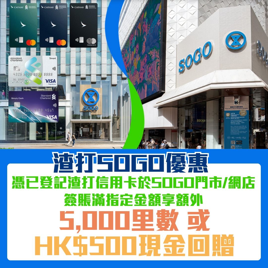 - 憑已登記渣打信用卡於崇光SOGO門市或網上商店簽賬滿指定金額可享額外5,000里數/HK$500現金回贈