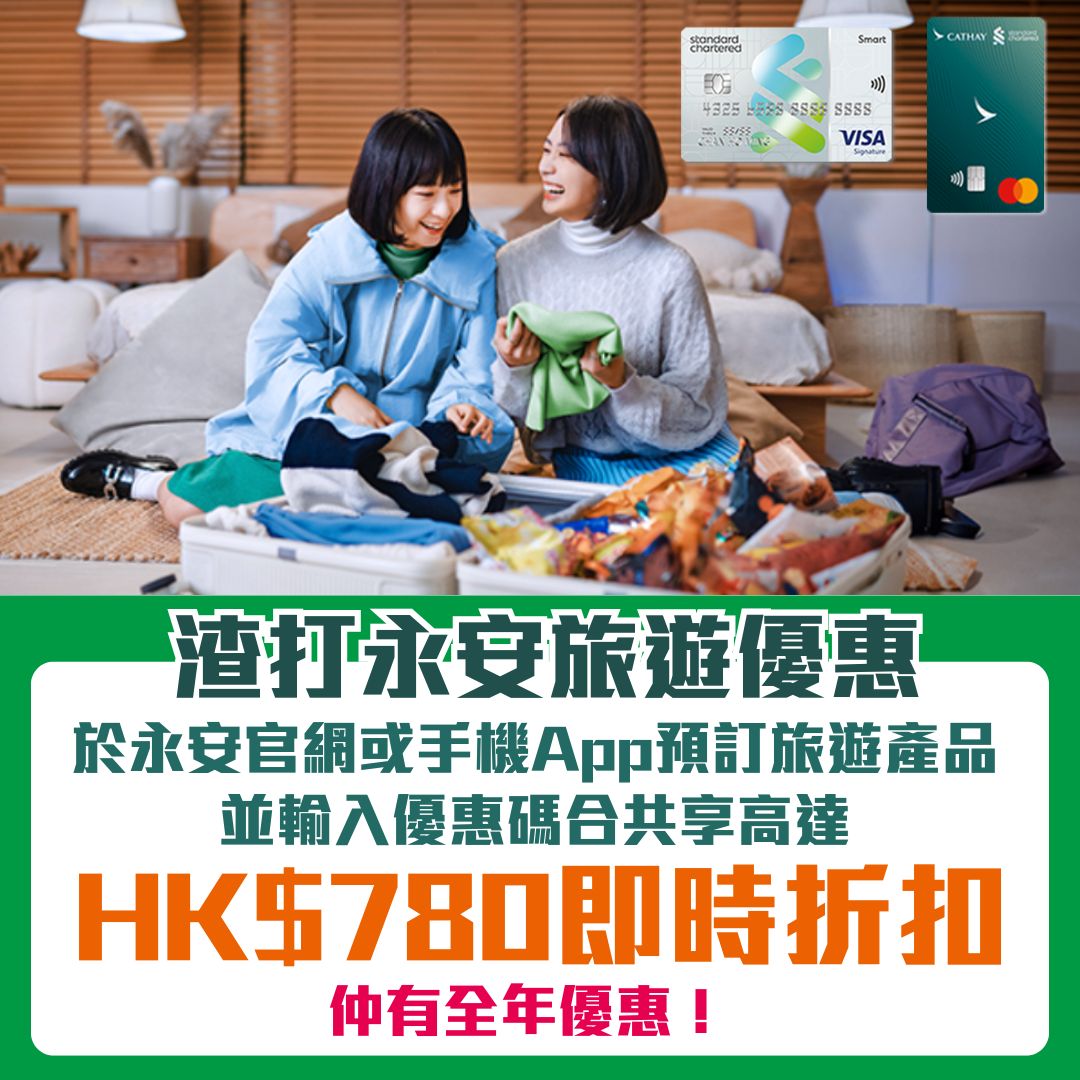 - 優惠一:渣打Visa及Mastercard客戶於永安官網或手機App預訂以下旅遊產品及輸入優惠碼享高達HK$780即時折扣