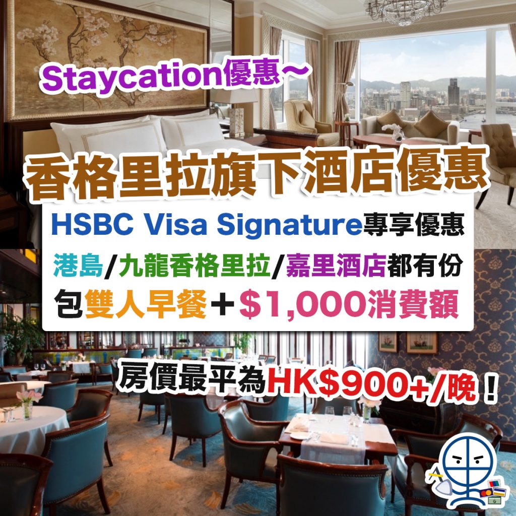 【香格里拉酒店優惠】HSBC Visa Signature專享Staycation優惠 住宿連雙人早餐+$1,000消費額 房價最平為HK$900+/晚!港島/九龍香格里拉/嘉里酒店都有份!