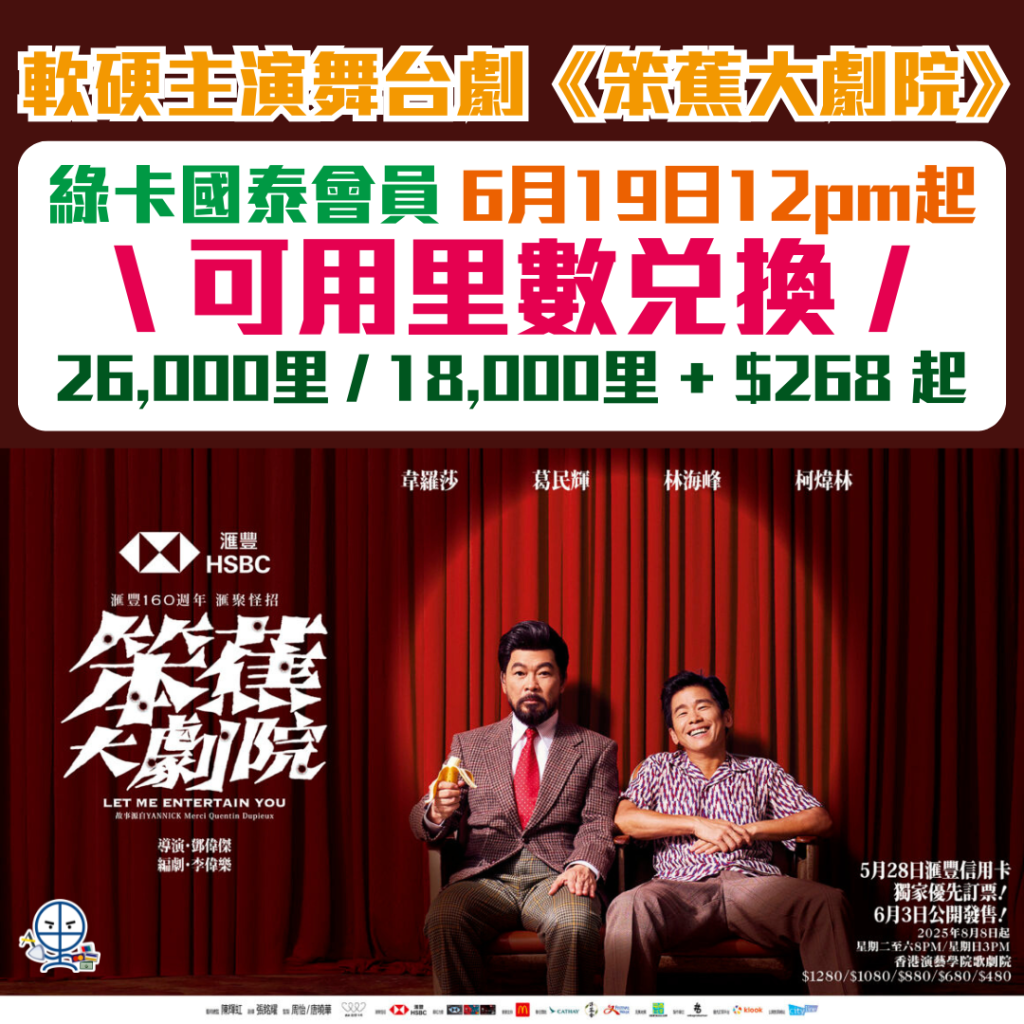 - 里數門票兌換網站:https://lifestyle.asiamiles.com/zh/HK/p/DES_0001_70001/1-ticket-to-hsbc-160th-anniversary-presents-%E2%80%9Clet-me-entertain-you%E2%80%9D-theatre-show-hkd1080-9-aug-2025