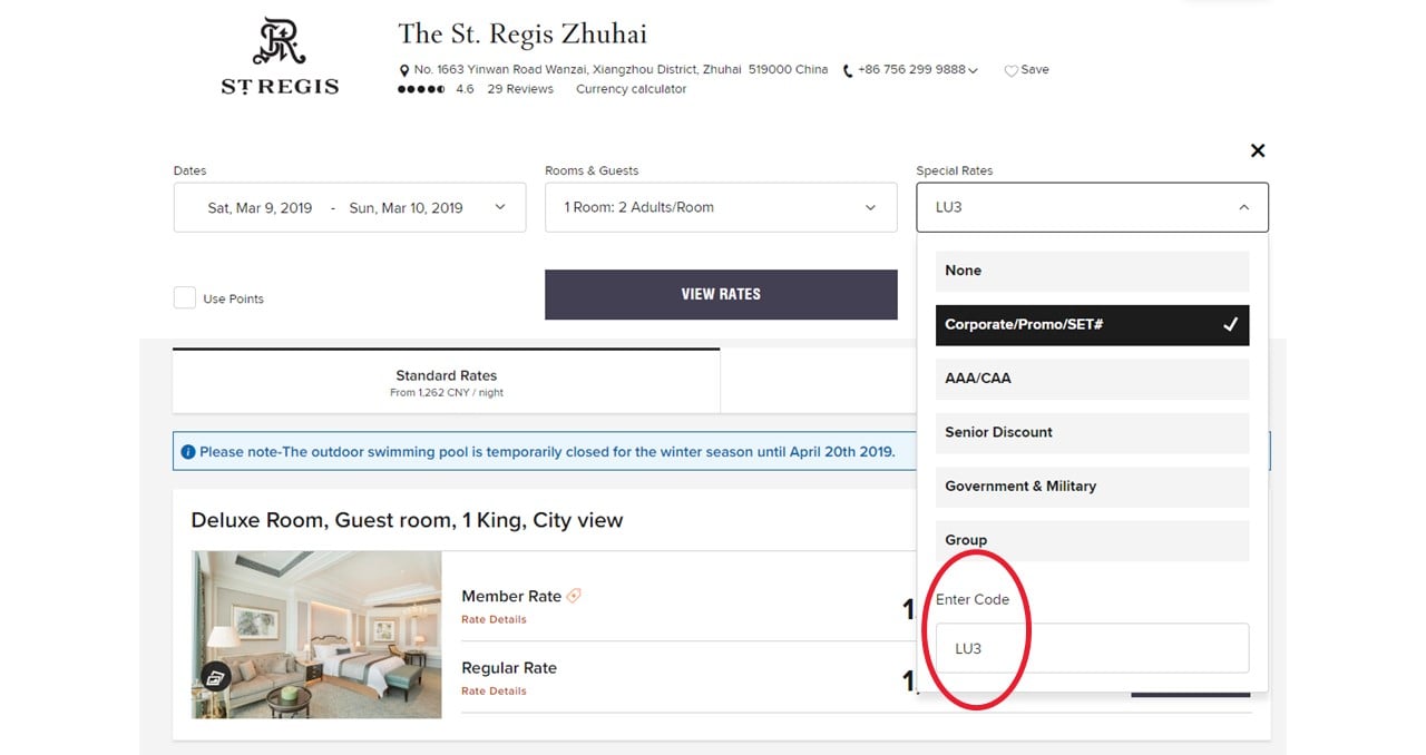 (2019年5月21日: 我問咗酒店呢個code已經失效,自己訂的話再用唔到)如果你無AE白金卡,就建議你係官網訂再用Luxury privilege code,係corporate/set/promo#果欄入: 「LU3」,其實呢個本身只能用到上年年底嘅銀聯白金卡優惠代碼,但官網到再用又訂到,再問酒店又肯認數。用法如下圖