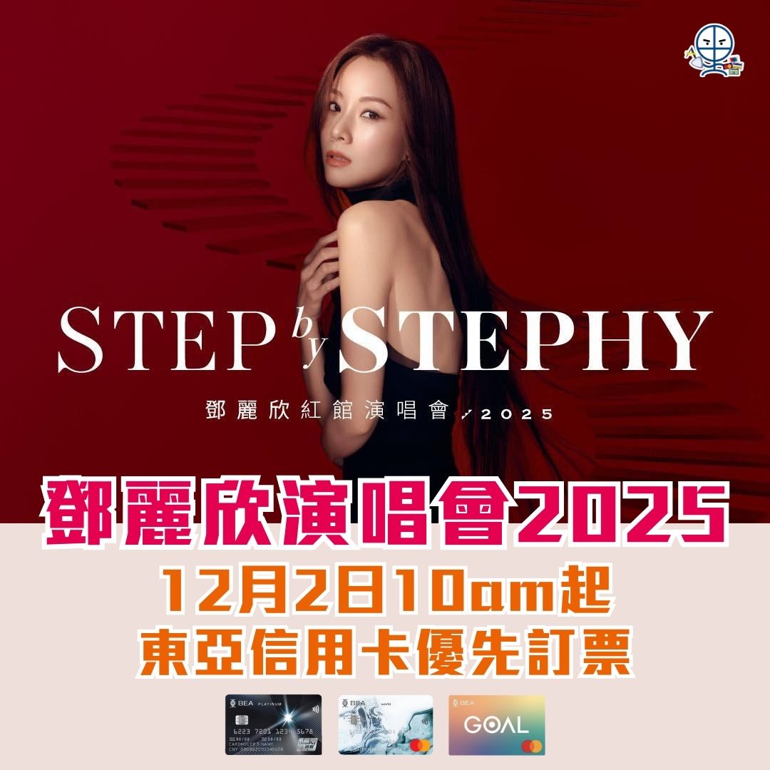 《STEP by STEPHY 鄧麗欣紅館演唱會 2025》東亞信用卡獨家優先訂票!鄧麗欣演唱會2025 詳情一文睇晒!2025年3月14 – 15日紅磡香港體育館舉行,票價由$480起!想睇Stephy首個紅館演唱會,留意東亞信用卡可於12月2 – 4日優先購票;12月2日公開發售!