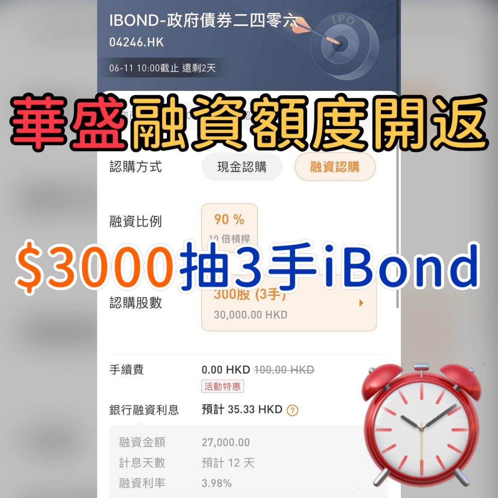 【新股孖展】華盛抽iBond融資額度重開!9成槓桿首3手免利息