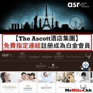 讀者報料,The Ascott 酒店集團有條link註册成為新會員就可以得到白金會籍(Referral code: AMEXPL)。本身似係同AE白金卡合作嘅promotion但我試完登記又無野要我認証張卡。本身呢個酒店集團我唔多識,有見過Ascott同Somerset。