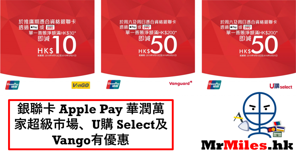 又有銀聯Apple Pay優惠!銀聯都真係幾進取…今次個優惠俾你玩到5月31日,華潤萬家超級市場、U購 Select $200減$50 及Vango買$30減$10!用Apple Pay/ Huawei Pay (華為支付?我未用過) 就拎到優惠,佢限一日一次但係無封頂用幾多日!如果樓下附近有華潤萬家超級市場、U購 Select及Vango買日常用品長用長有,咁計落呢個優惠都幾著數!