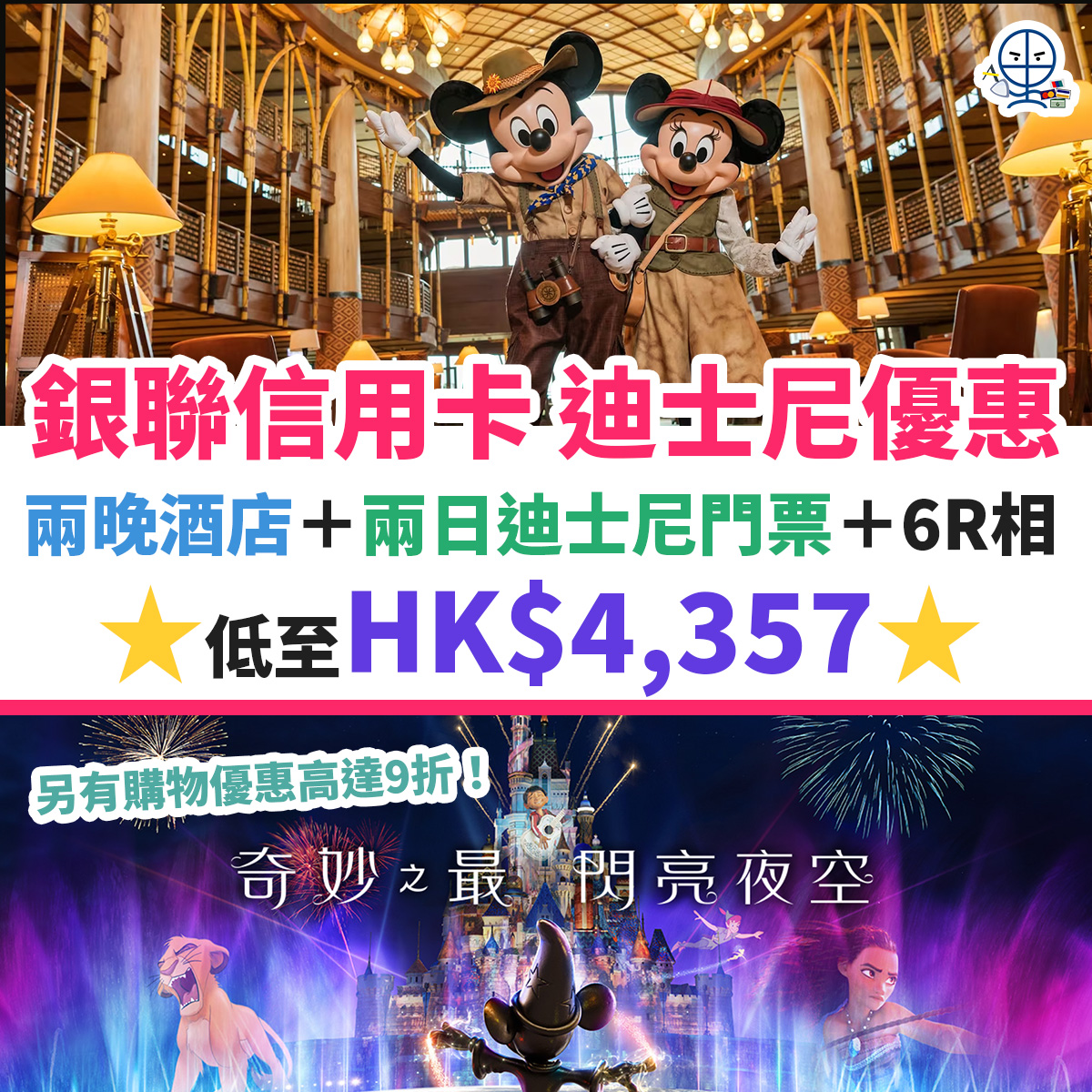 銀聯信用卡 迪士尼優惠︱兩晚酒店+兩日迪士尼門票兩張+6R數碼相!低至HK$4,357!另有購物優惠高達9折!
