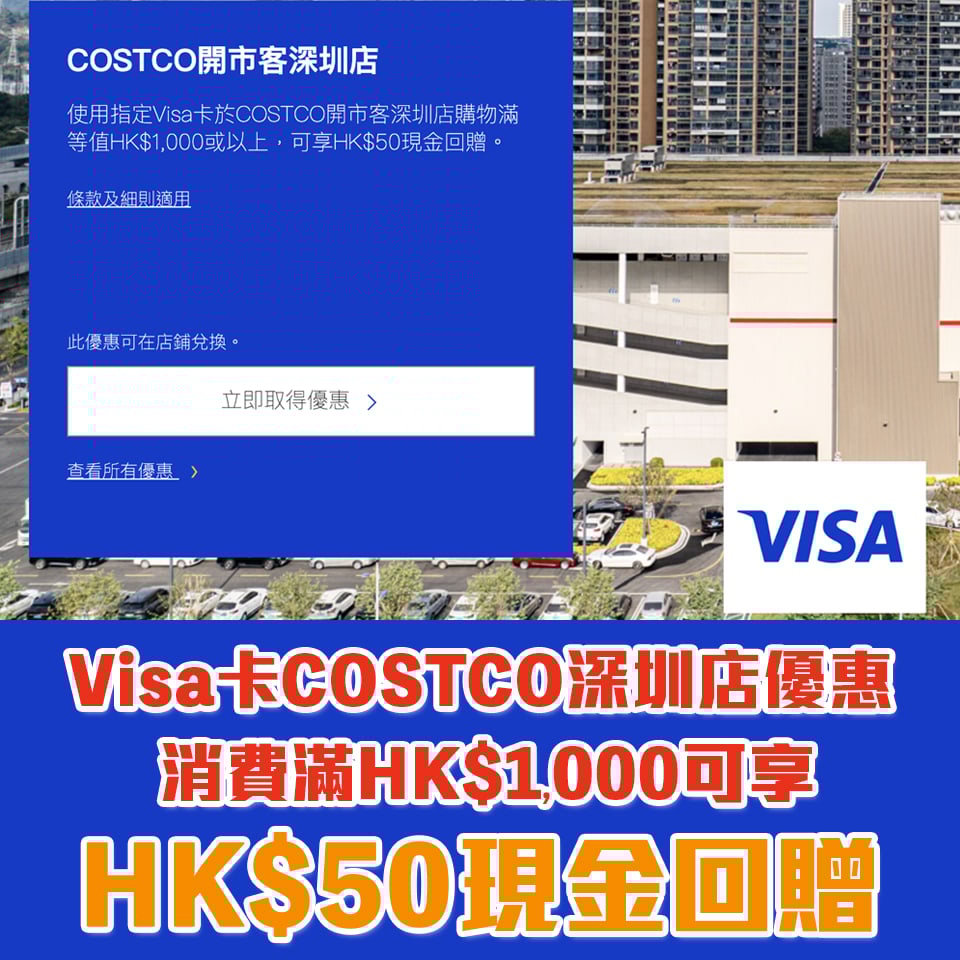 • 官網詳情:https://www.visa.com.hk/zh_hk/visa-offers-and-perks/costco%E9%96%8B%E5%B8%82%E5%AE%A2%E6%B7%B1%E5%9C%B3%E5%BA%97/161924?paymentType=9
