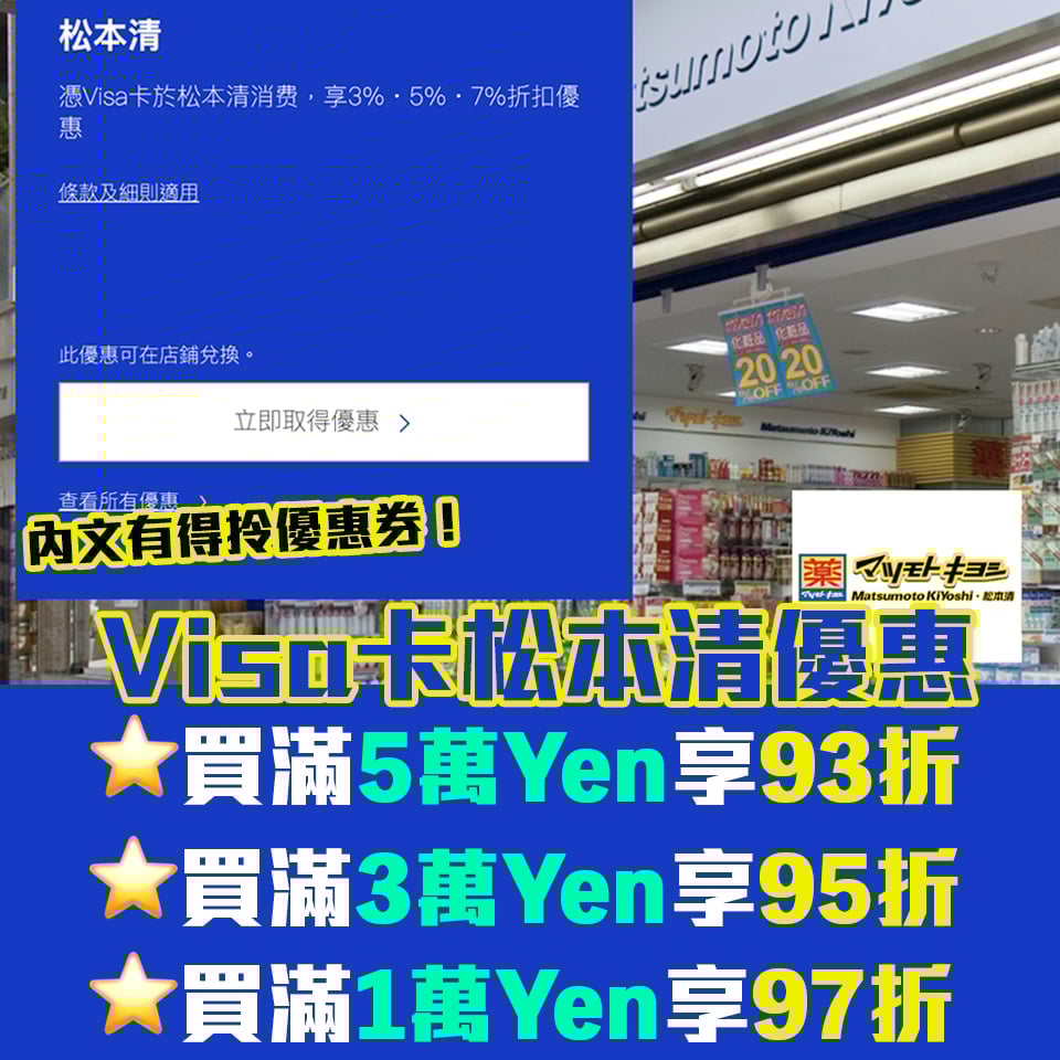 - 於松本清付款時需向收銀檯出示優惠券+Visa卡付款,即可享以下折扣優惠