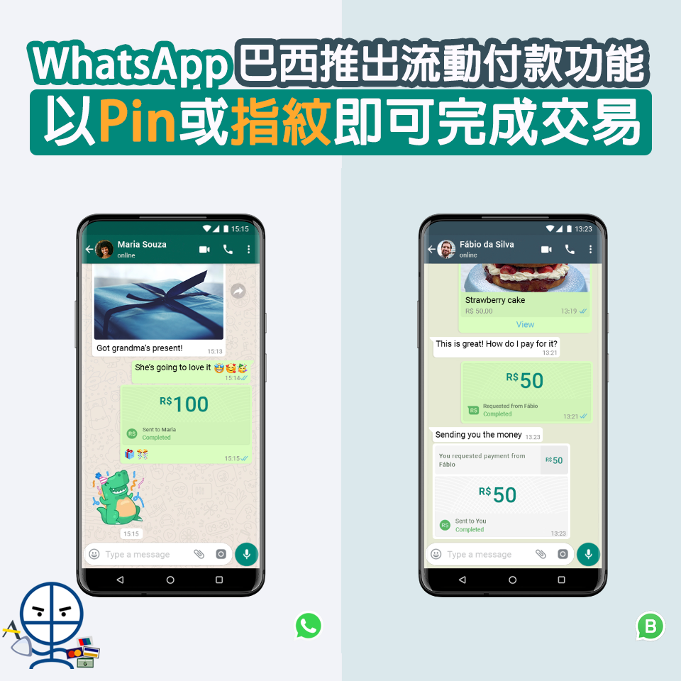 WhatsApp推出流動付款功能 巴西地區率先使用 以Pin或指紋即可輕鬆完成交易