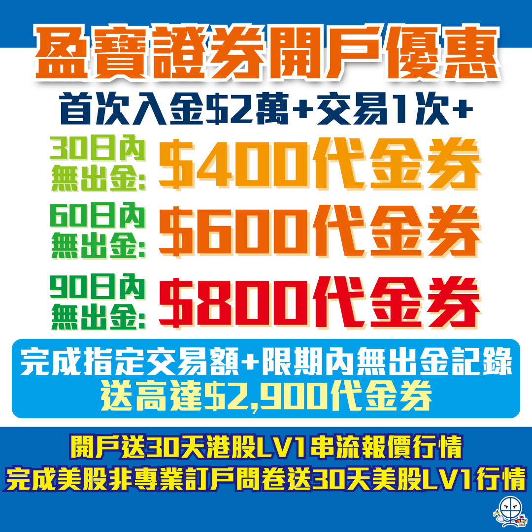 (已完結)盈寶證券11月開戶優惠,入HK$2萬並留存+交易一次就賺HK$800代金券!或完成指定交易額賺高達HK$2,900代金券!